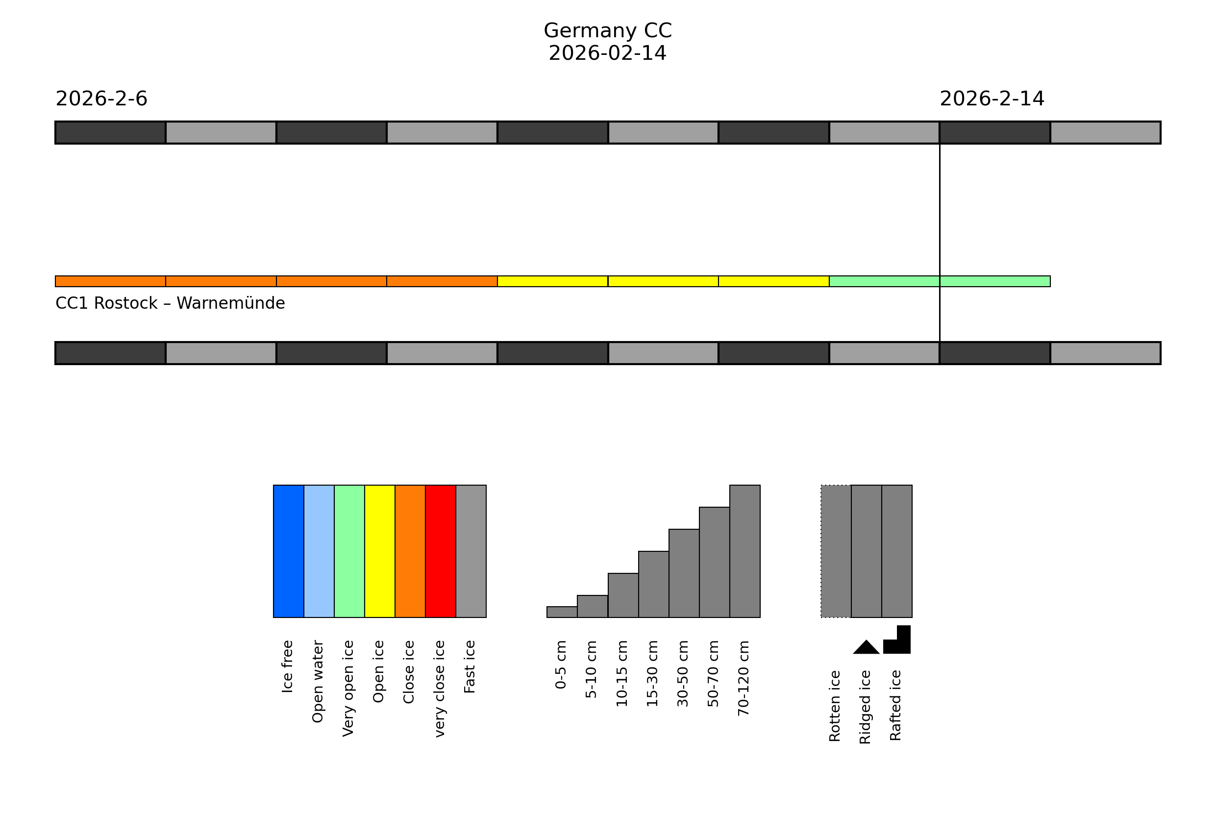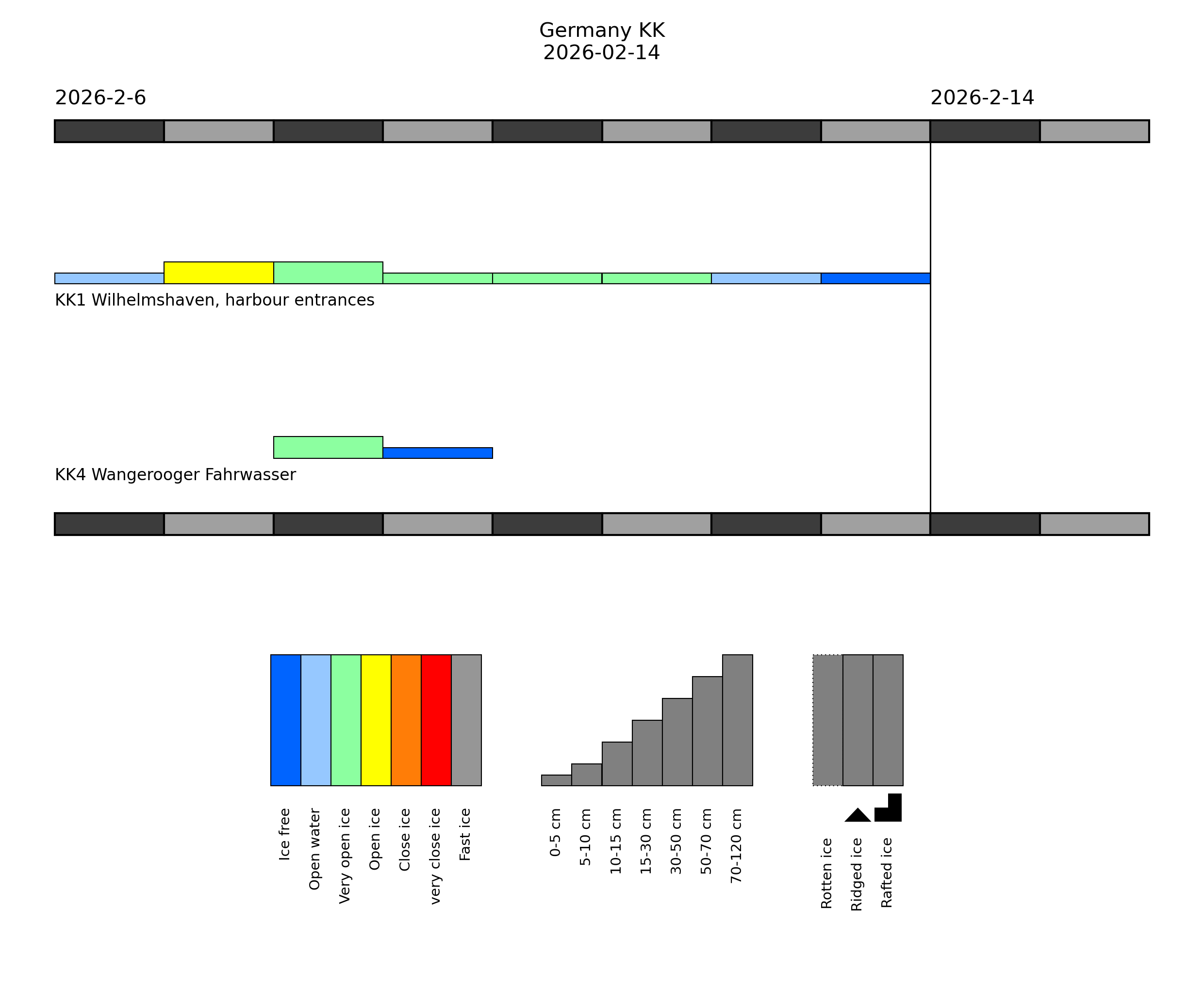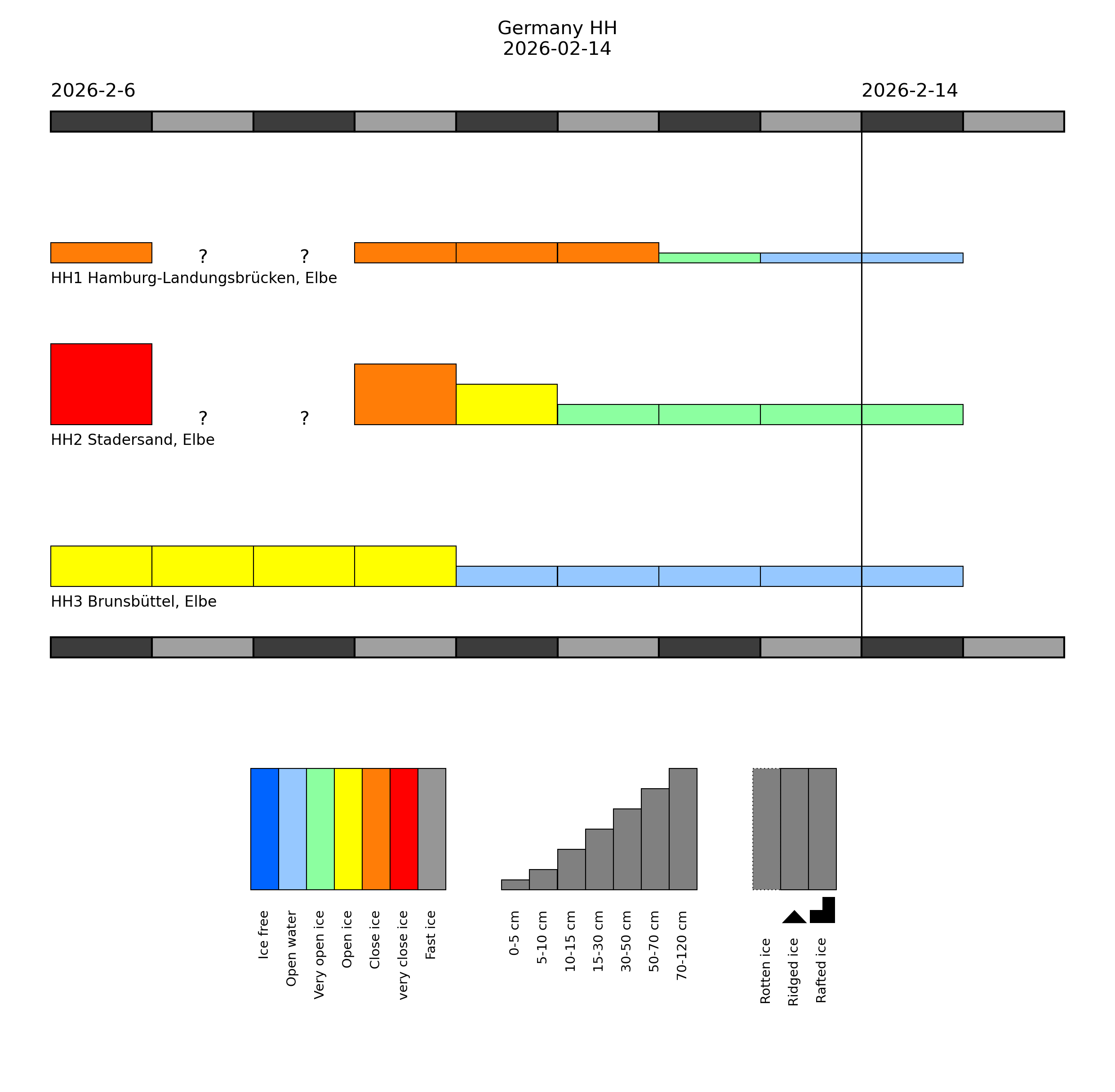 In the harbours of Hamburg and in the Elbe estuary, there is very open drifting brash ice or open water, up to 10 cm thick in places. Thin ice may occur in harbours and at some sheltered places in the North Frisian Wadden Sea.Western Baltic Sea