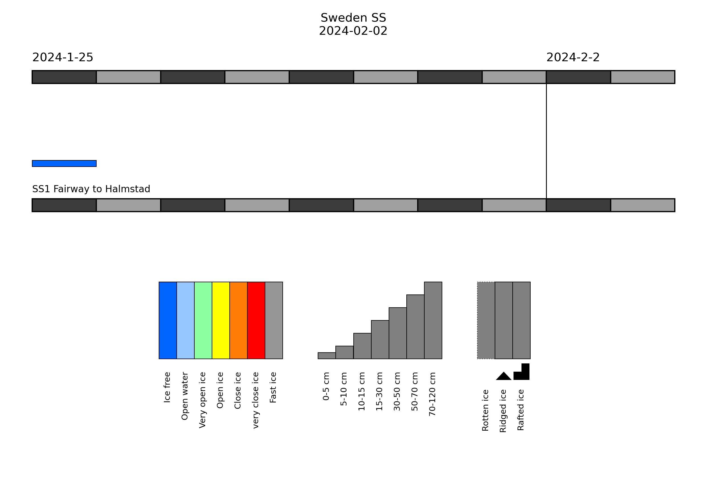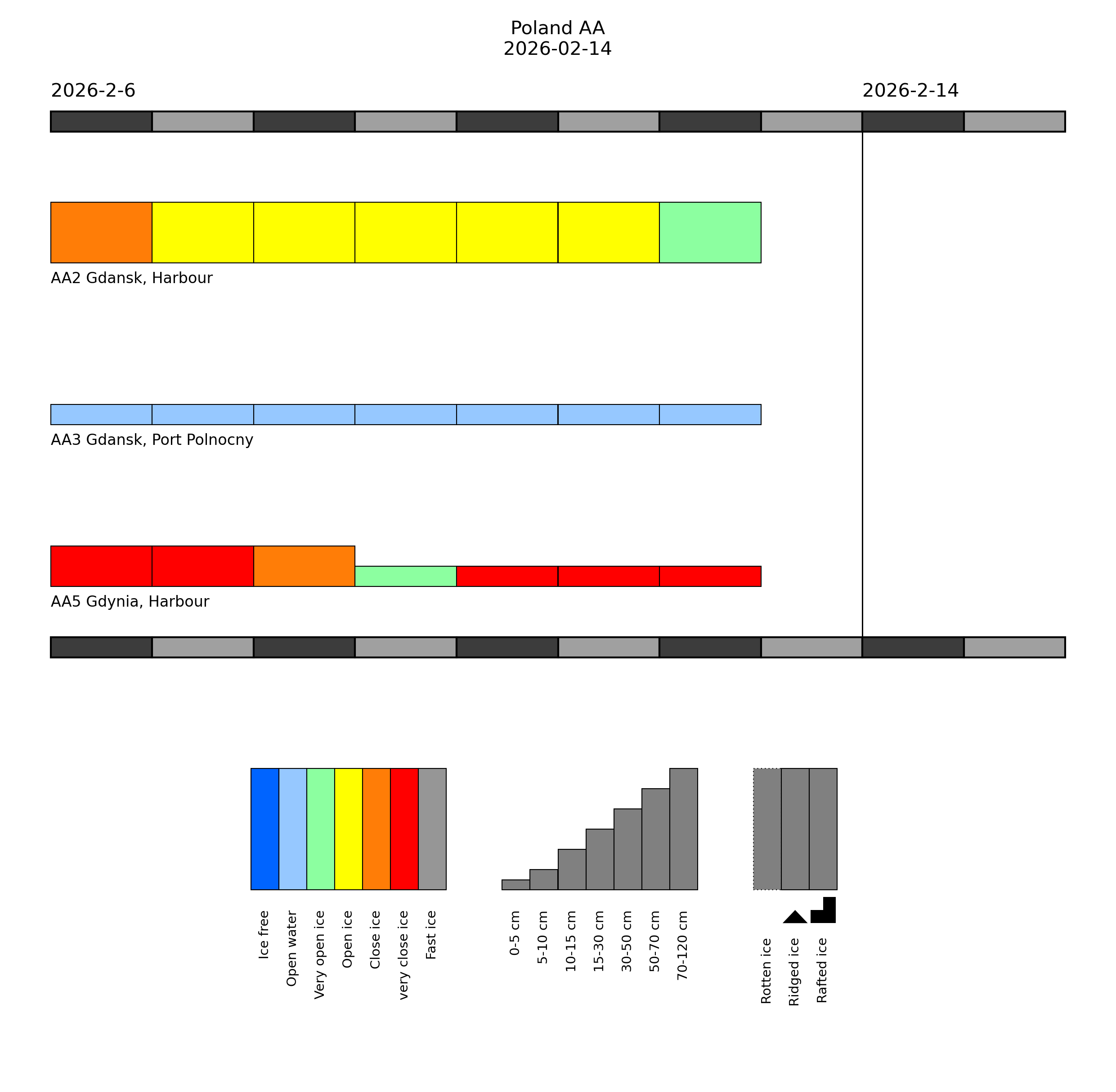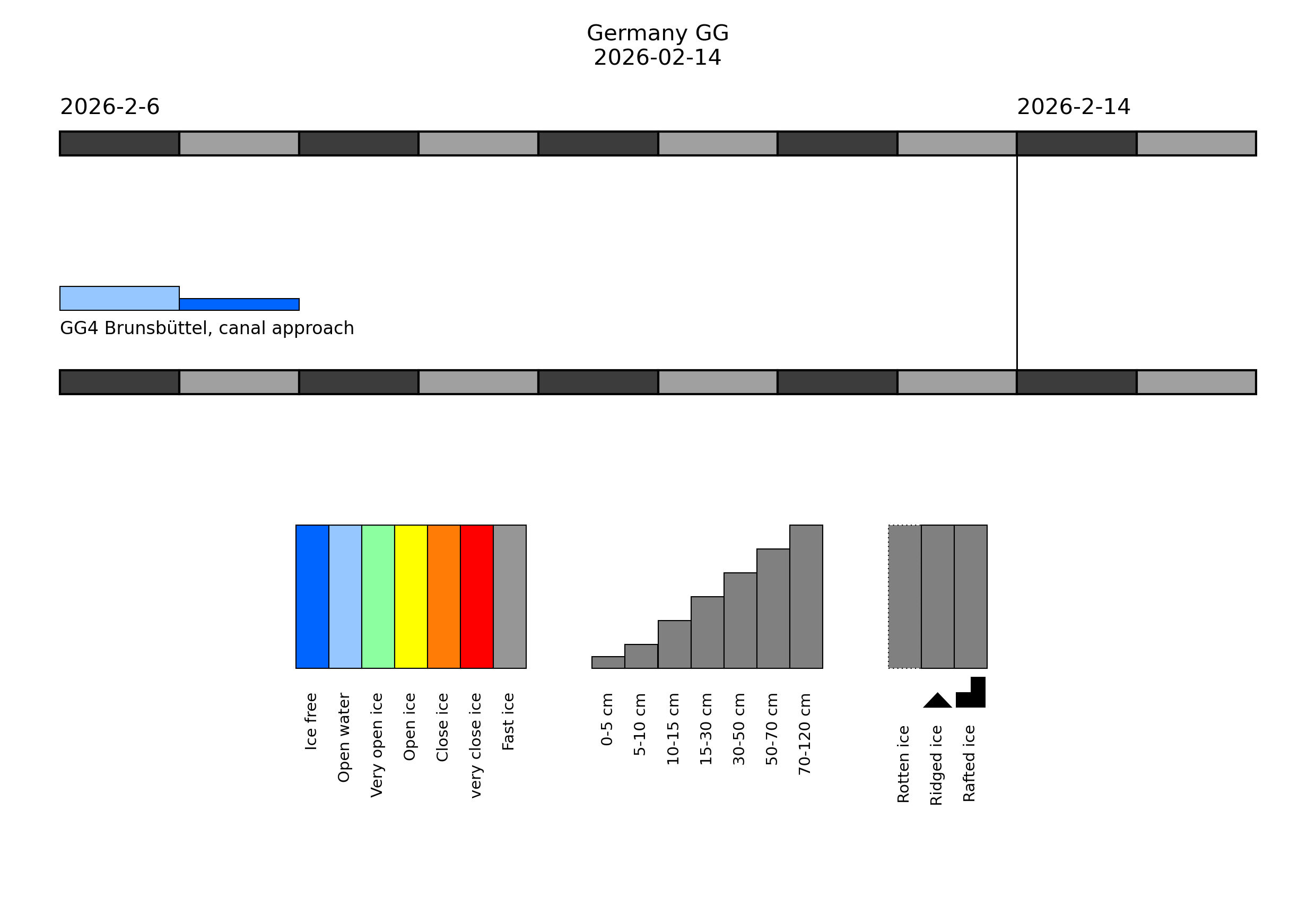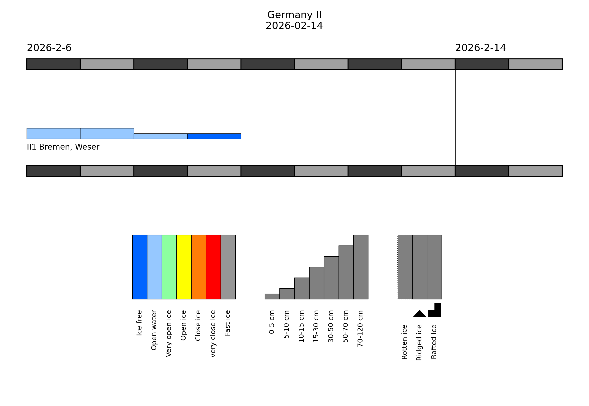 In the harbours of Hamburg and in the Elbe estuary, there is very open drifting brash ice or open water, up to 10 cm thick in places. Thin ice may occur in harbours and at some sheltered places in the North Frisian Wadden Sea.Western Baltic Sea