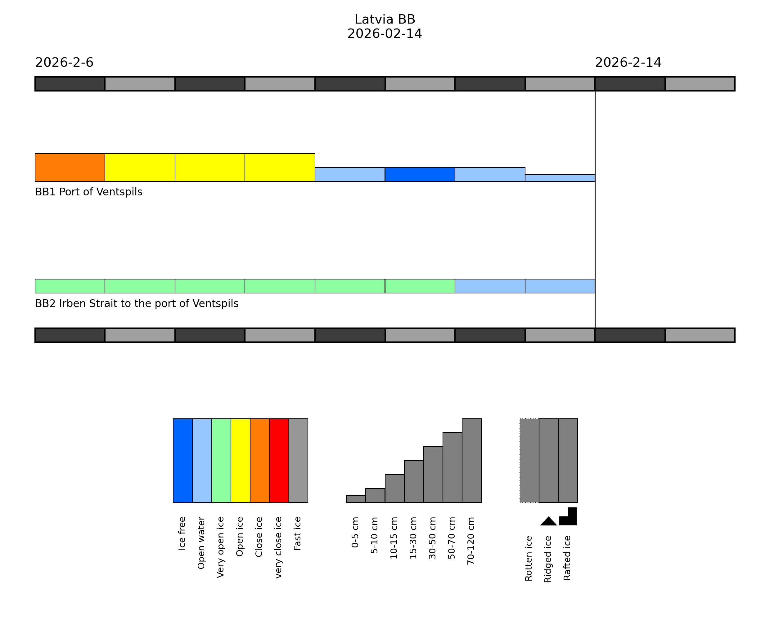 2026-02-14THE PORT OF RIGA IS CLOSE PACK ICE, THE PORT OF VENTSPILS IS OPEN PACK ICE, THE PORT OF LIEPAJA IS VERY CLOSE PACK ICE. THE FAIRWAY FROM PORT OF RIGA TO IRBE STRAIT IS VERY CLOSE PACK ICE, THERE ARE BIG ICE FLOES. FURTHER SEA FROM VENTSPILS TO LITHUANIAN BORDER IS OPEN WATER.=